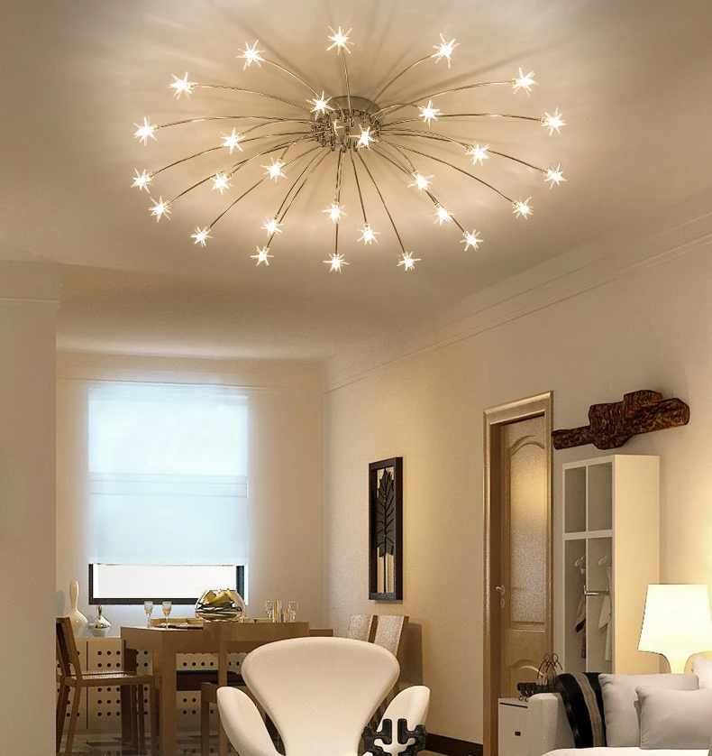 - Капли, сосульки, аналоги самоцветов и множество других стилизованных световых точек могут сделать комнату красивее, чем у кого-либо из знакомых. Кстати, раньше подобные решения использовались исключительно для натяжных и подвесных потолков, но не так давно появились накладные варианты.