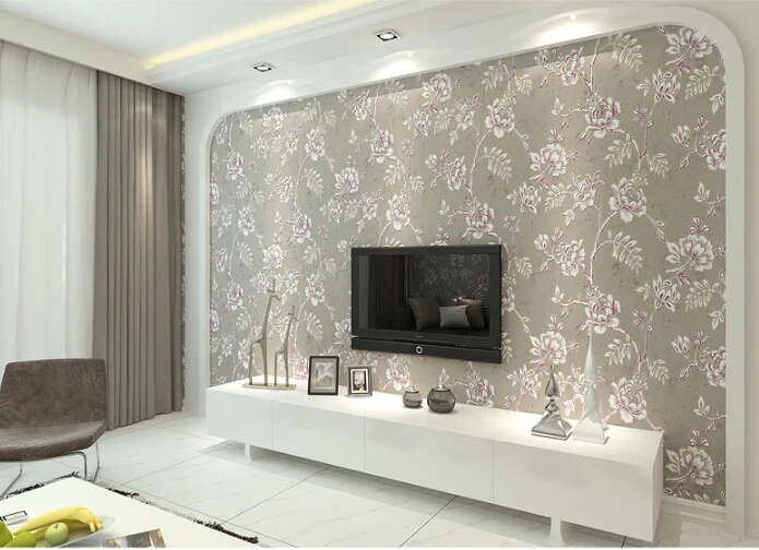 Часто при отделке стен в гостиной обоями многие дизайнеры останавливаются на виниловых картинах. Все дело в том, что такие изделия наиболее устойчивы к повышенной влажности и идеально подходят для стен с дефектами (сколы, трещины). Кроме того, они легкие, что значительно упрощает и ускоряет процесс склейки.