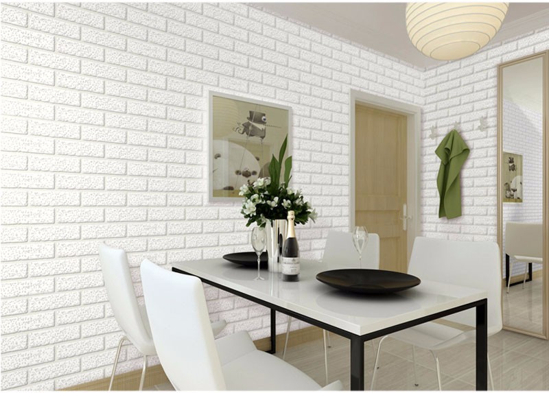 Стена из белого кирпича в интерьере, может быть оклеена обоями с разной стилистикой кирпичной кладки, наиболее подходящей к дизайну помещения и при этом всегда будет смотреться «тепло» и оригинально.